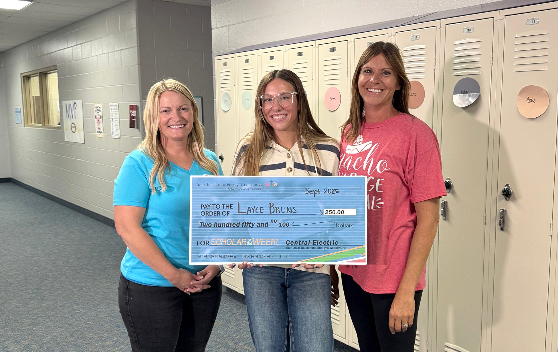 Tara Miller, Manager of Communications for Central Electric, said, "We commend Layce for being a positive role model for other students. Her achievements at school and in the community make her an excellent choice for Scholar of the Week."