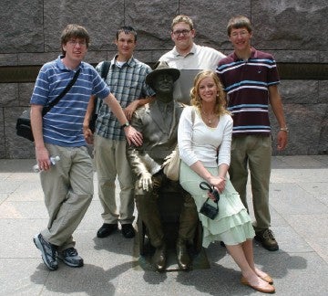 Kevin Larsen (left) takes a photo with Youth Tour friends at the FDR Memorial in 2006. -Photo by Brenda Kleinjan, Sioux Valley Energy.